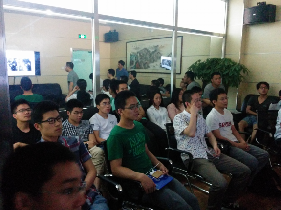 图4. Claire Ellen Max教授和TMT项目副总经理刘凤川一起,与国家天文台的冯麓副研究员以及理化所的近三十名师生,就天文应用激光器、自适应光学(AO)、以及大视场多导星技术等等科学问题展开热烈的讨论